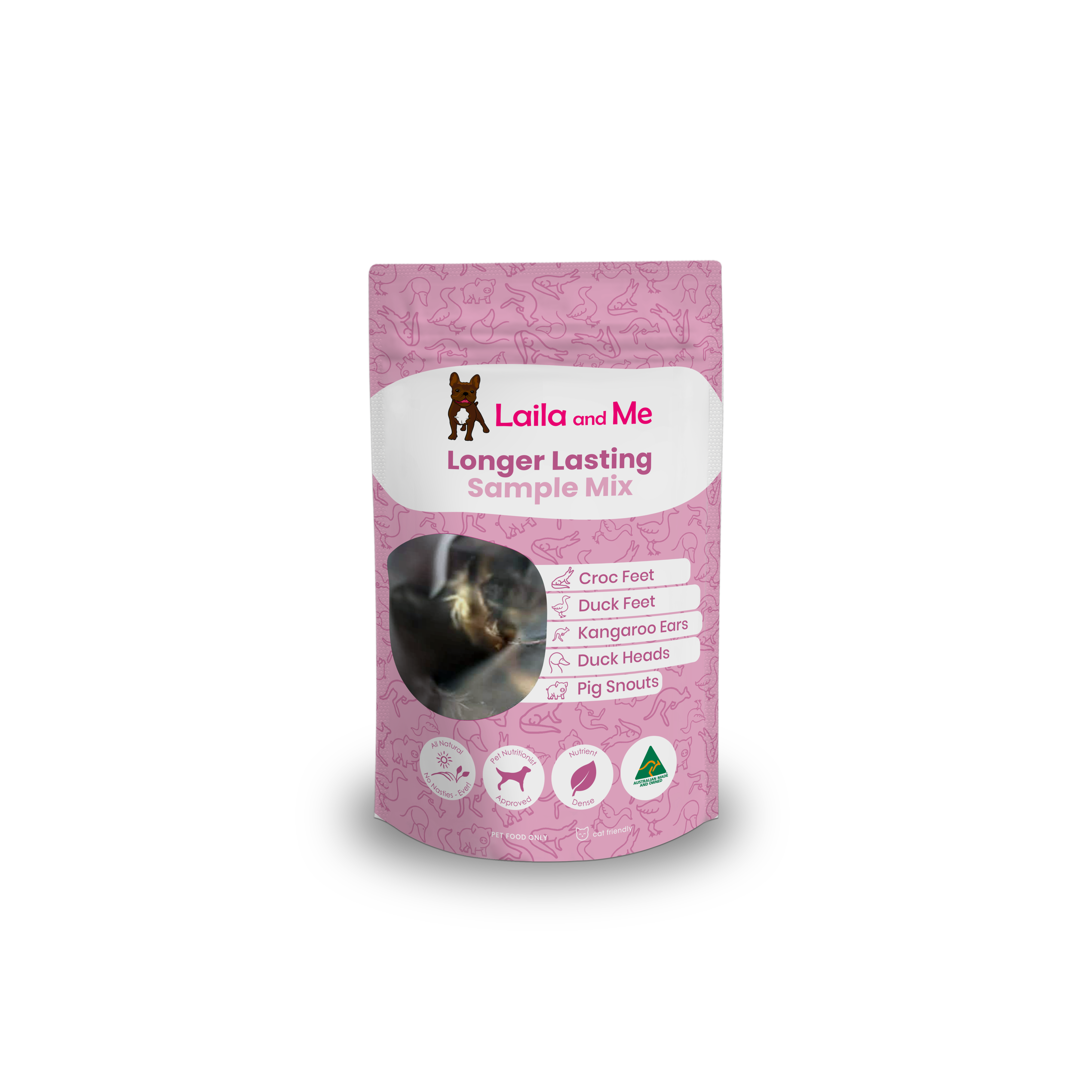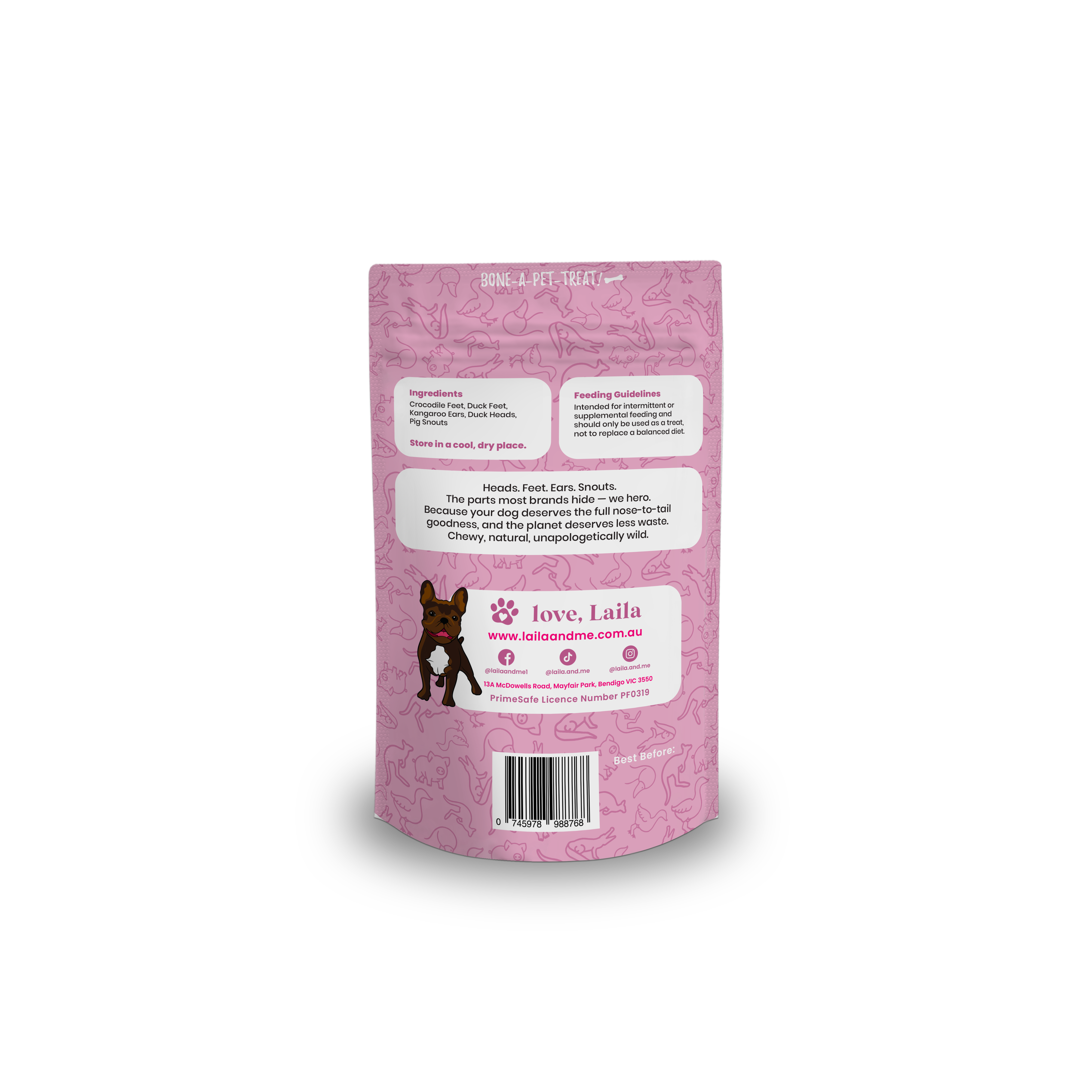 The Longer Lasting Sample Mix is for dogs who treat chew time like a mission and for pet parents who know a five-minute snack simply will not cut it. This pack features Crocodile Feet, Duck Feet, Kangaroo Ears, Duck Heads and Pig Snouts, celebrating the delicious parts other brands hide while giving your dog the full nose-to-tail experience.