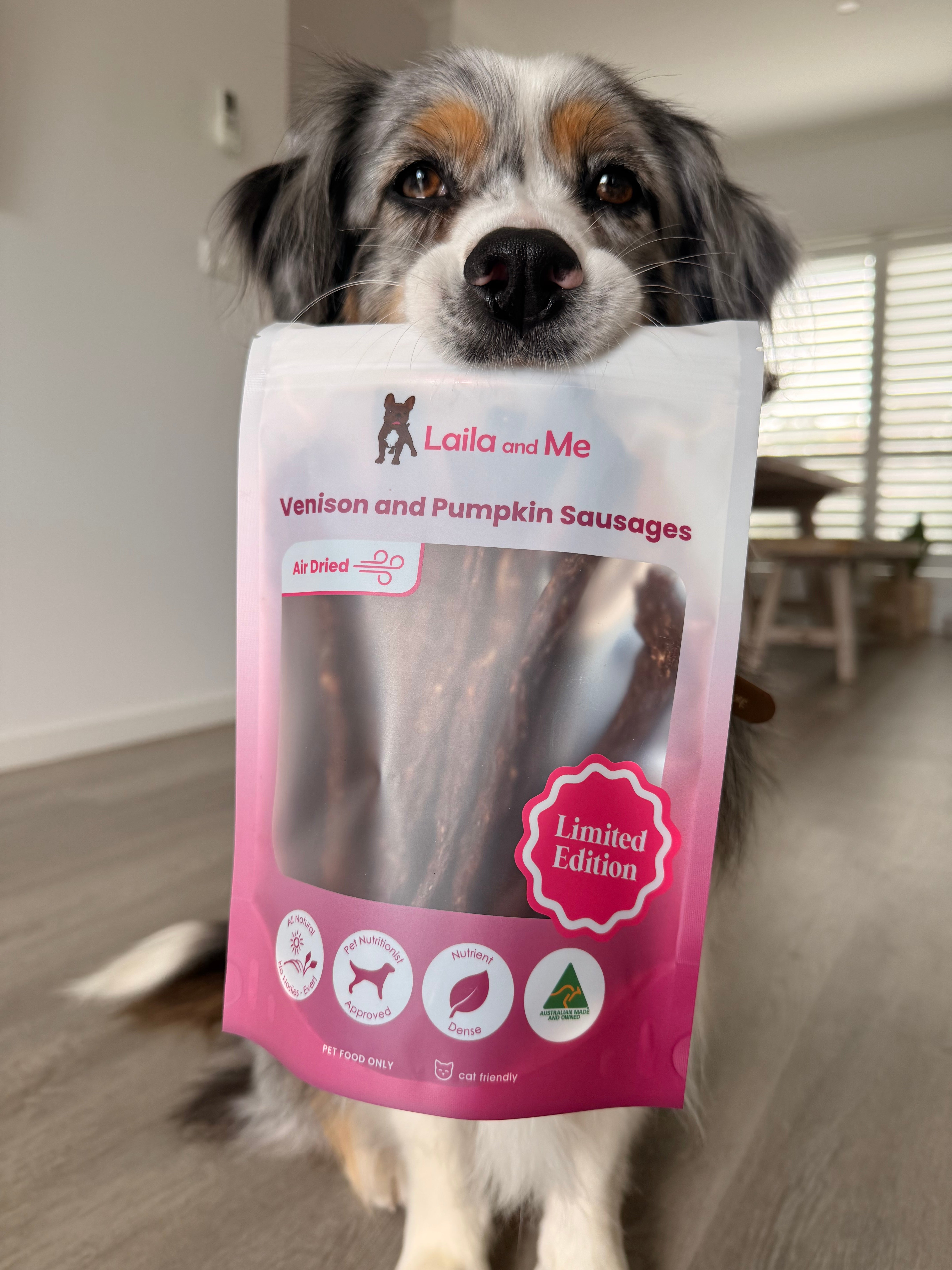 Pumpkin adds natural fibre and essential nutrients that help support healthy digestion, stool quality and overall gastrointestinal wellness. It also contains vitamins A, C and E along with antioxidants that may support immune and skin health. Together, venison and pumpkin form a balanced treat that nourishes while remaining light on the stomach.