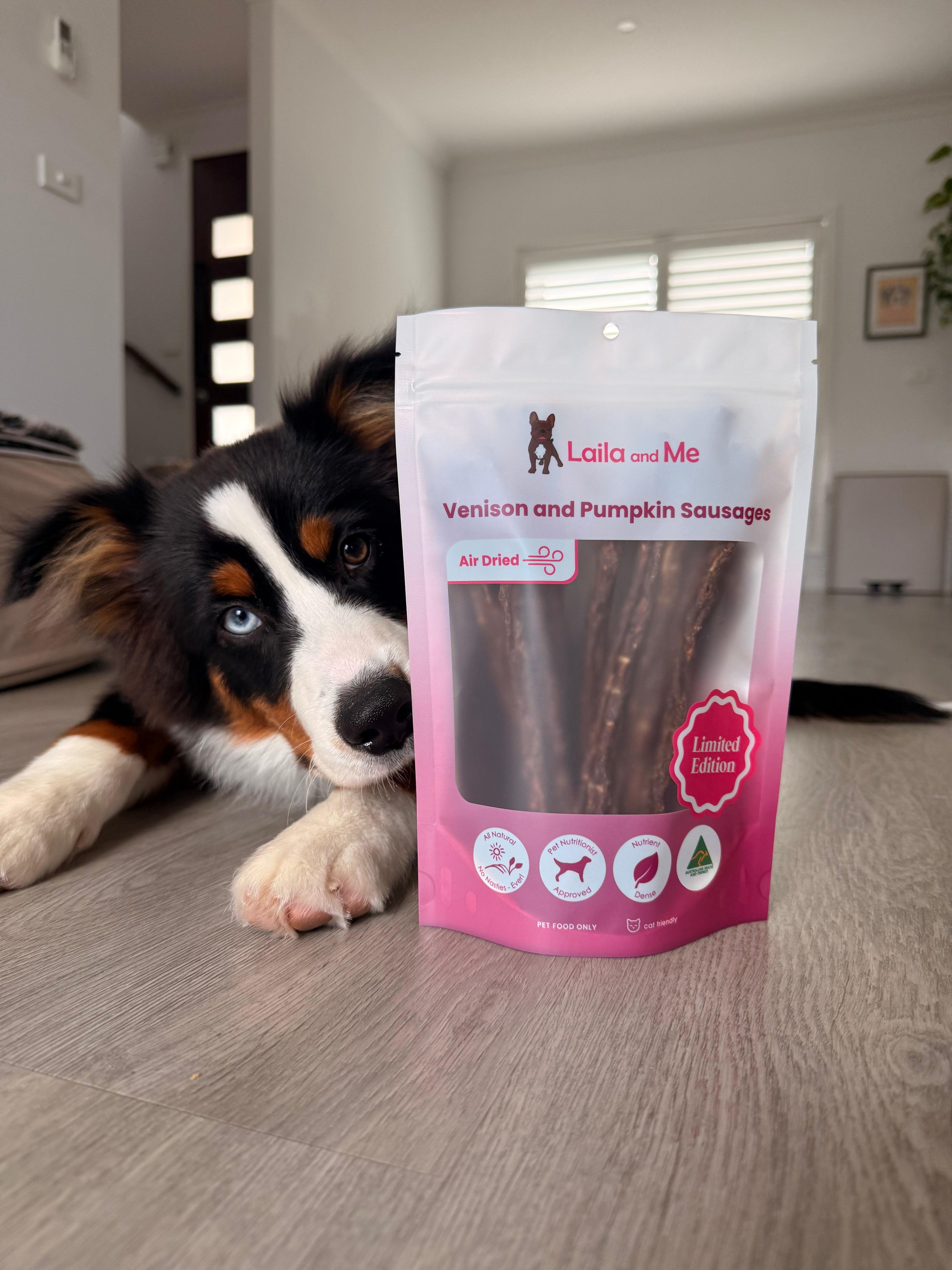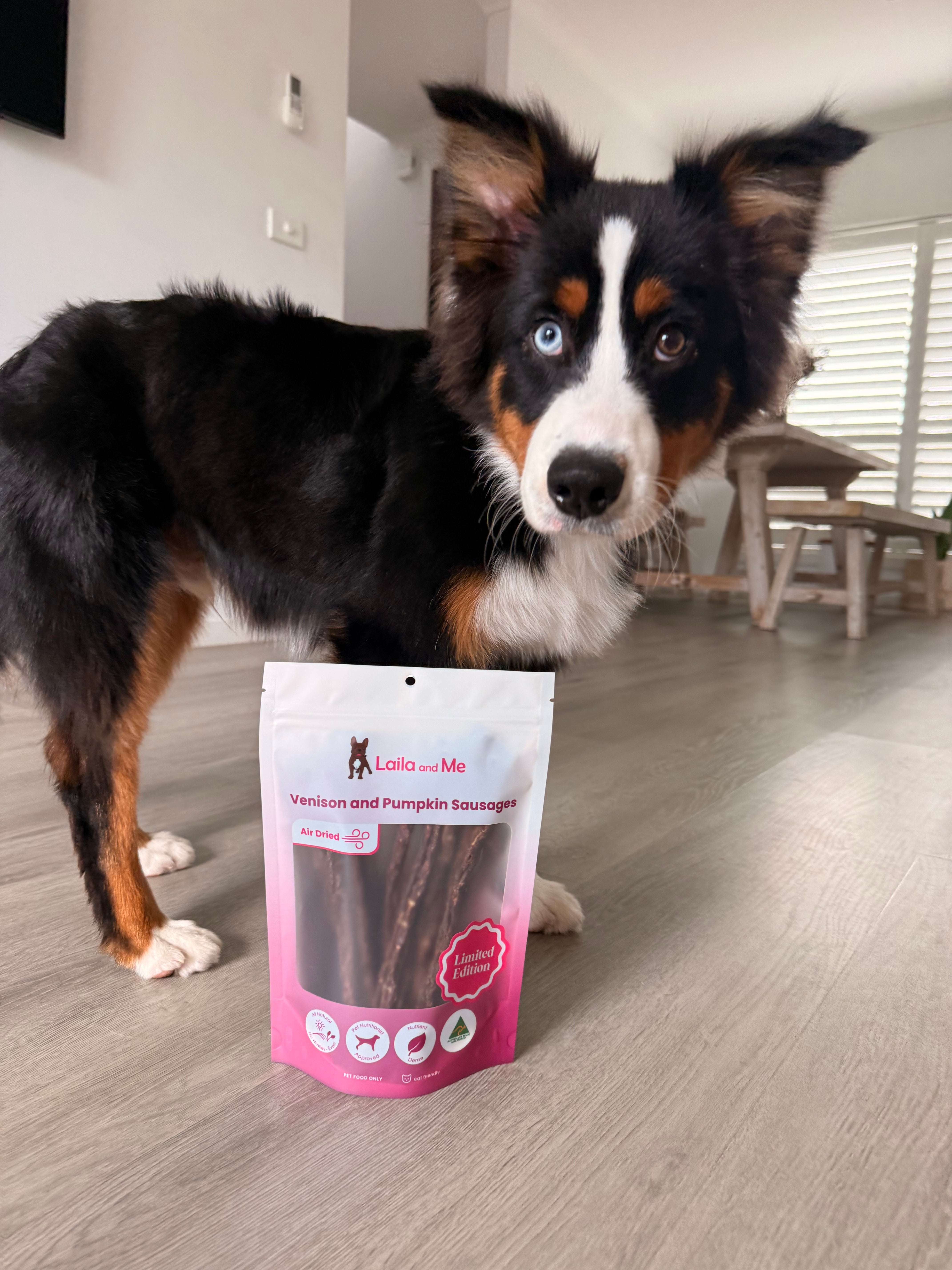 About our Gently Air-Dried Venison and Pumpkin Sausages Treat: