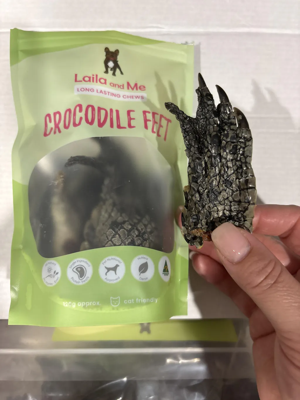 Australian farmed crocodile feet, air-dried with one ingredient. For dogs with restricted diets, fussy eaters, and pet parents who want to watch the chaos unfold.