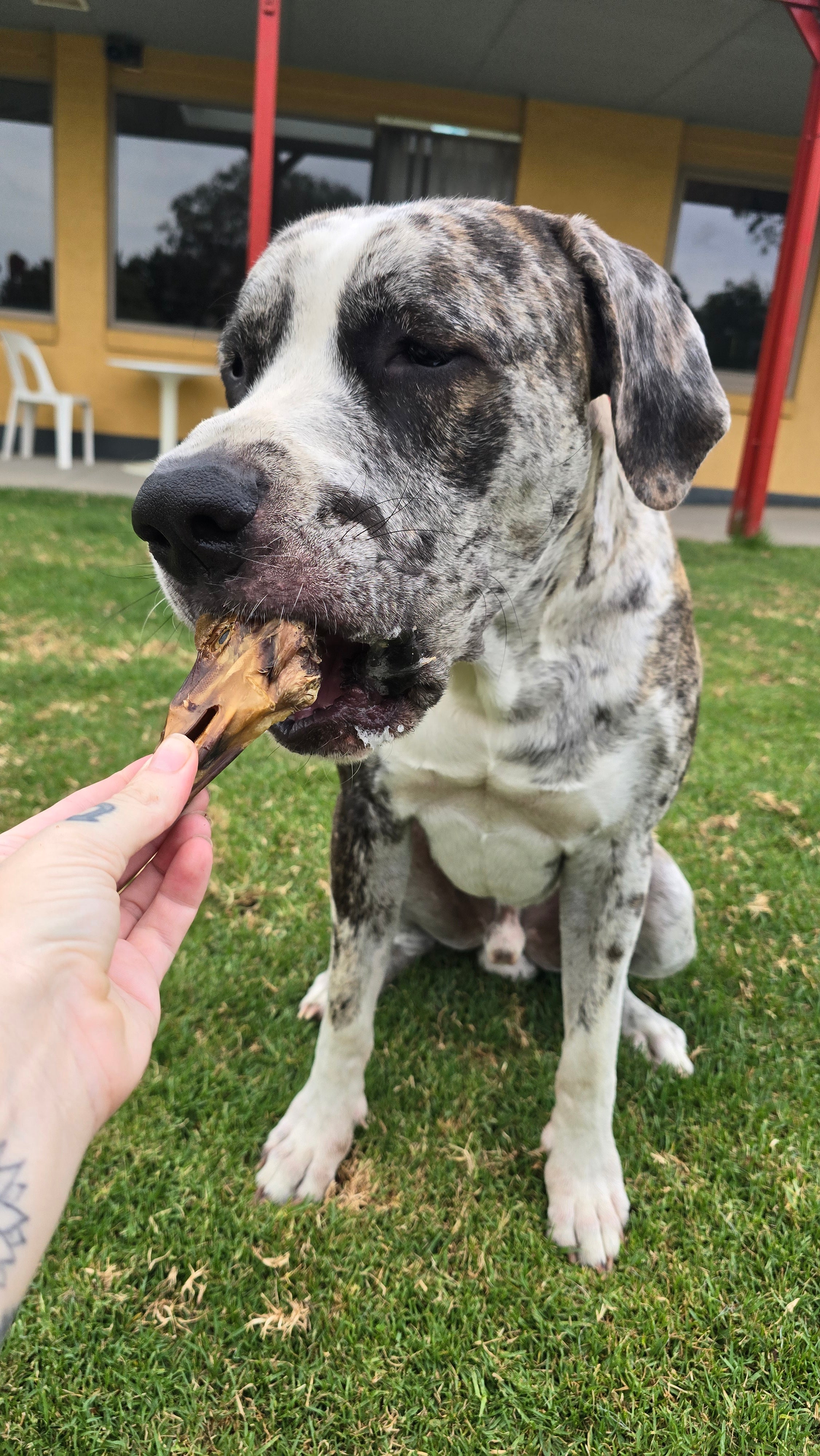 Dogs and cats will naturally swallow food/treats/bones that are just small enough to pass through their oesophagus, if they cannot swallow it whole, they will regurgitate it up and grind it again to make it small enough to swallow. This can be quite distressing for humans to see as we think our dog is choking, so we strongly suggest you supervise your dog and make sure the treats you are giving them are size appropriate for your dog's chew style.