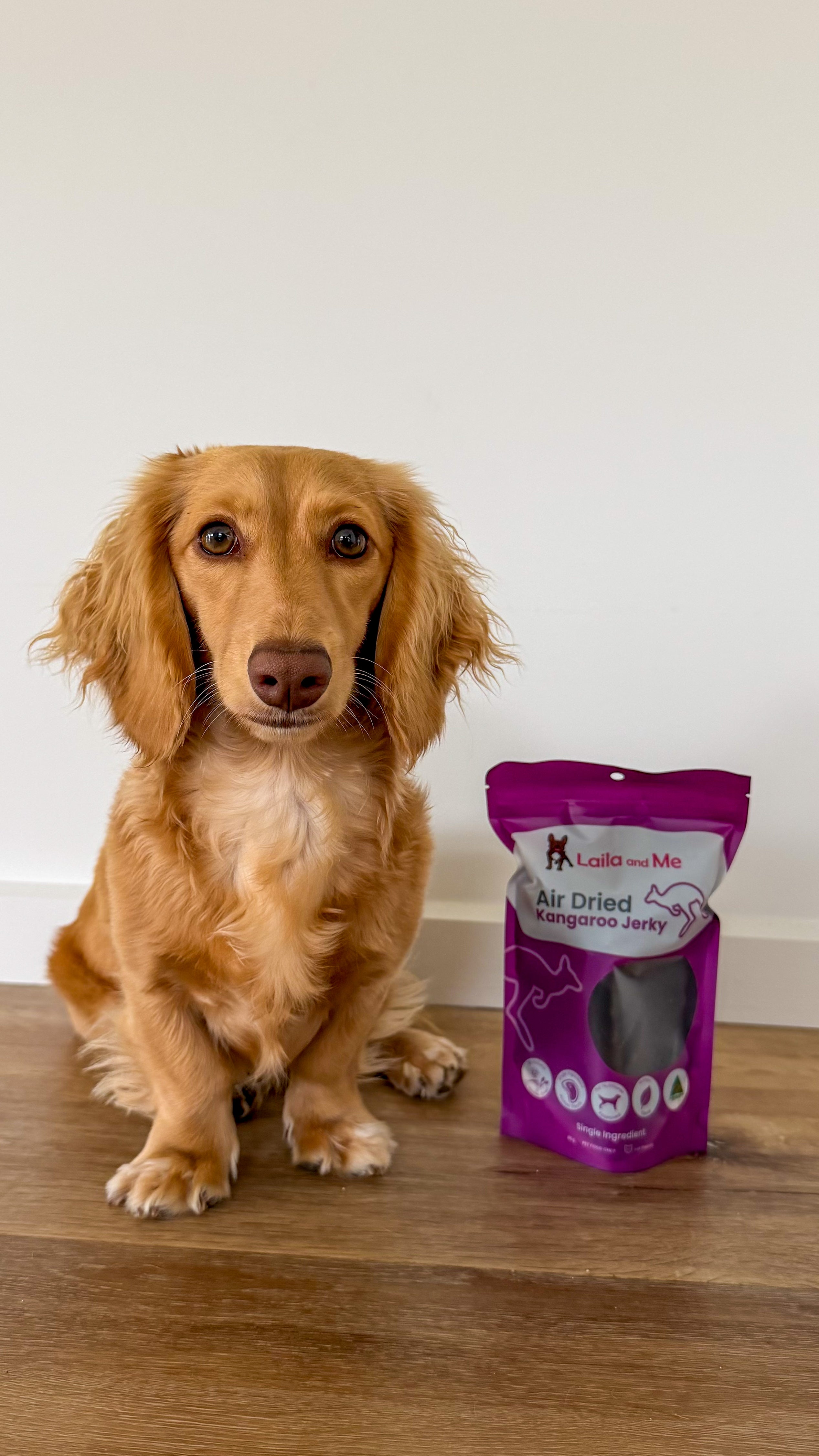 Dehydrated Kangaroo Jerky for dogs is a single protein product ingredient, which means we have added nothing extra in the dehydrating process; making it a healthy nutritious dog treat. There is no preservatives, salt, sugars or additives in our natural kangaroo jerky.