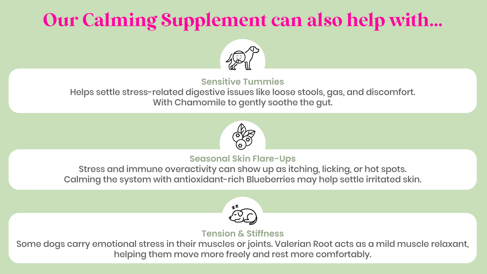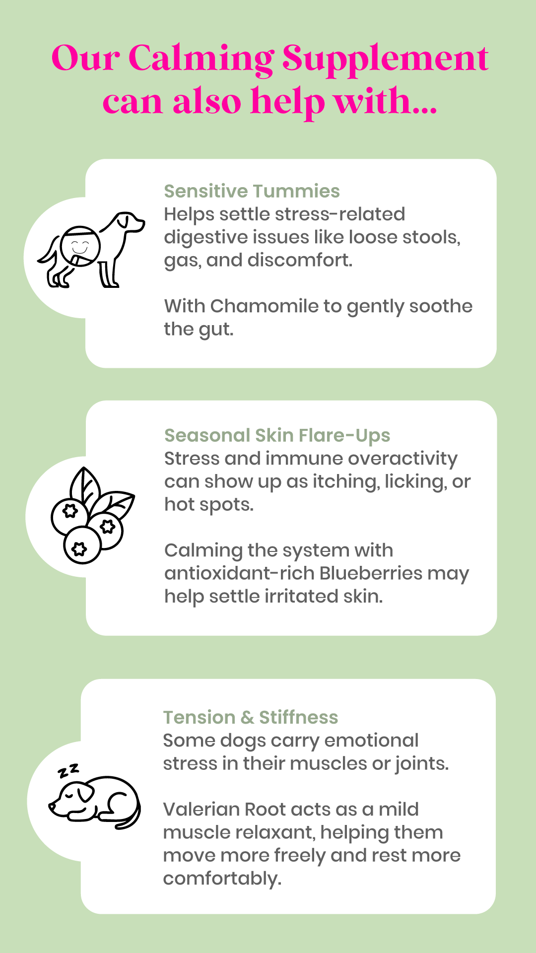 Formulated for dogs that struggle with change, noise, or overstimulation. This plant-based supplement supports calm behaviour, gut health, and overall wellbeing, without causing drowsiness. Designed for sensitive systems, it targets the gut-brain connection and physical stress responses to help your dog stay balanced, settled, and comfortable in daily life.