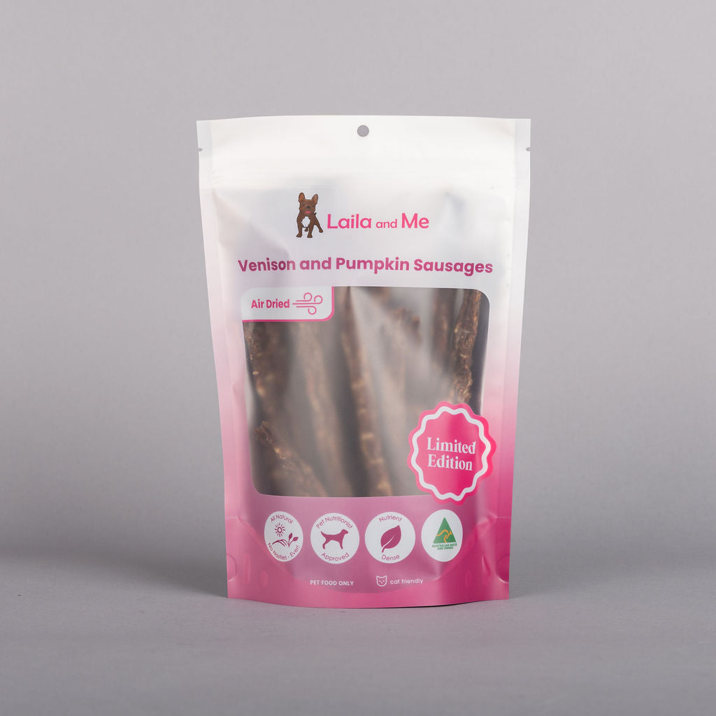 Our Venison and Pumpkin Sausages pair lean venison with nutrient-dense pumpkin to create a wholesome treat especially suitable for dogs with sensitivities or dogs that require easily digestible ingredients. Venison is a novel, low-fat protein source that provides iron, zinc and essential amino acids while staying gentle on digestion. This makes it a strong option for dogs with allergies to common proteins.