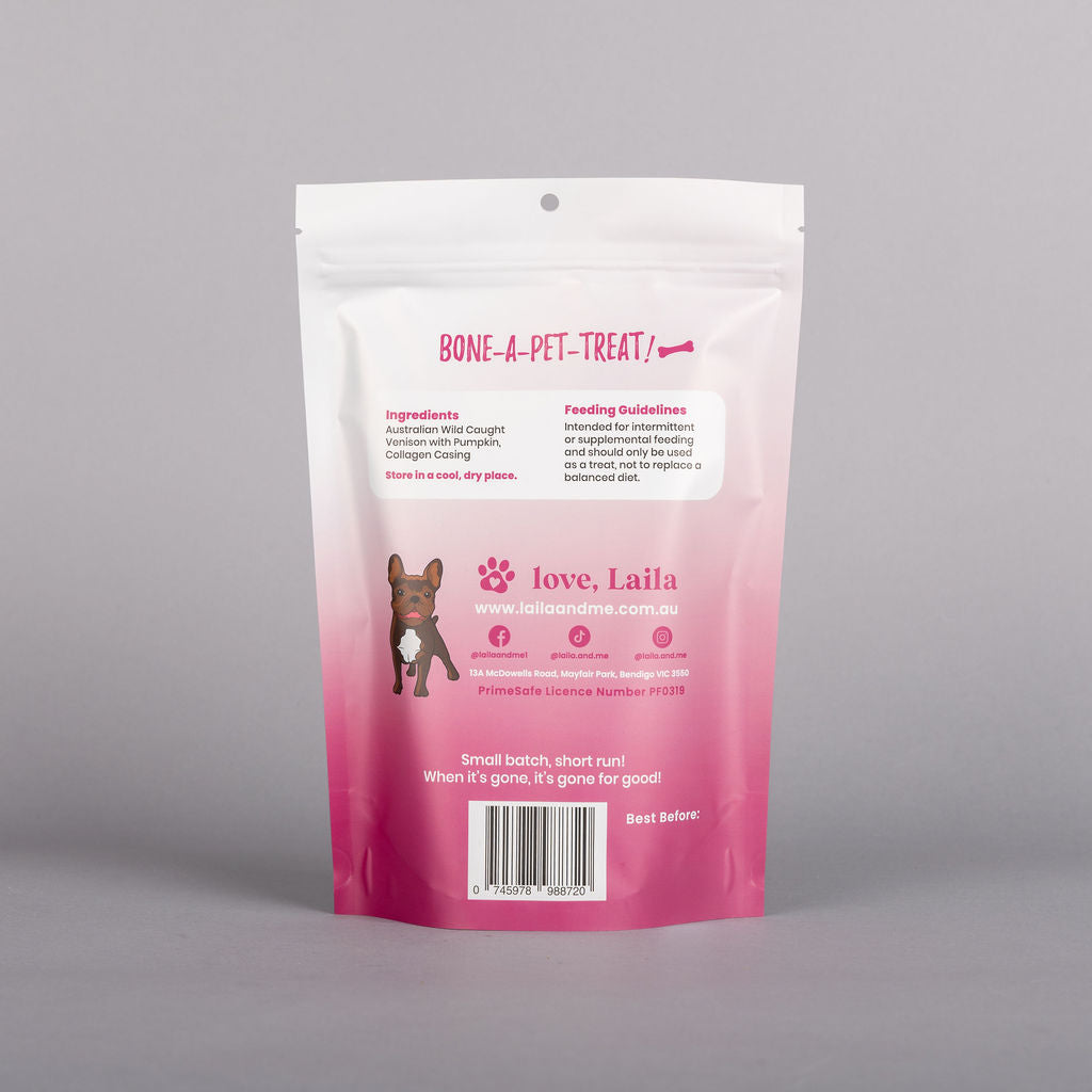 Pumpkin adds natural fibre and essential nutrients that help support healthy digestion, stool quality and overall gastrointestinal wellness. It also contains vitamins A, C and E along with antioxidants that may support immune and skin health. Together, venison and pumpkin form a balanced treat that nourishes while remaining light on the stomach.